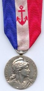 Médaille d'honneur pour actes de courage et de dévouement Des médailles d'honneur pour actes de courage et de dévouement étaient décernées sous Louis XIV et Louis XVI. Par décision Royale du 2 mars 1820 Louis XVIII autorisa de nouveau le Ministre de la Marine à décerner des médailles d'honneur non portables. Elles furent rendues portables par décision de Louis-Philippe du 12 avril 1831 sur la proposition du ministre de la marine et appelé Croix de juillet. De 1877 à 1899 le médaillon porte l'effigie de la République de Barre, elle est ensuite remplacée par la République de G .Marey. Le médaillon est suspendu à un ruban tricolore vertical. L'avers du médaillon porte une effigie de la république, de profil droit, entourée de la légende " REPUBLIQUE FRANCAISE " . Le revers porte la légende " MARINE MARCHANDE " ou " MINISTERE DE LA MARINE " et "COURAGE ET DEVOUEMENT", encadrant une ancre de marine avec un trident pour la pêche et un caducée pour le commerce.